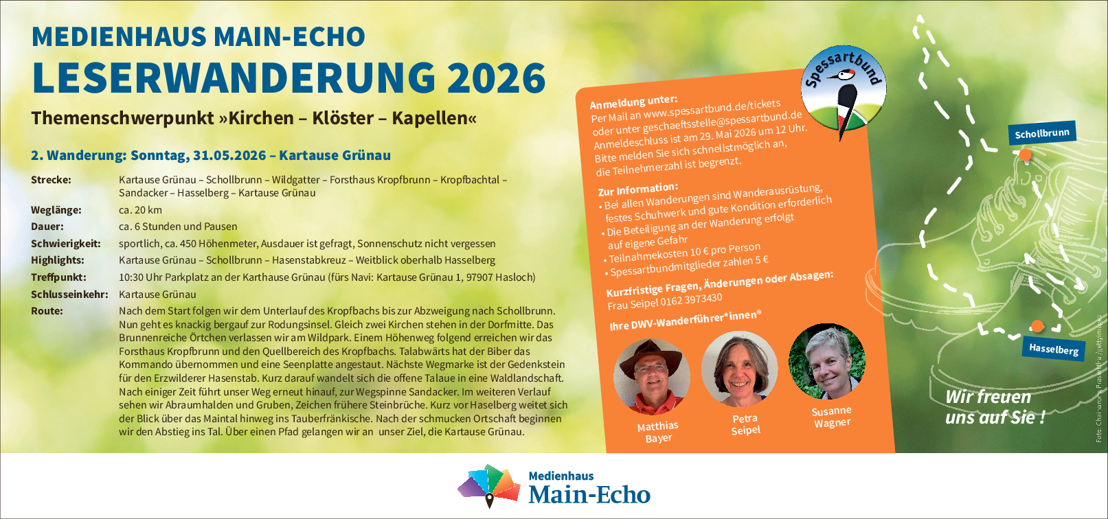 Anmeldung demnächst hier! Main Echo - Leserwanderung Themenschwerpunkt "Kirchen, Klöster und Kapellen" Sonntag, 31.05.2026 Strecke: Kartause Grünau – [...]