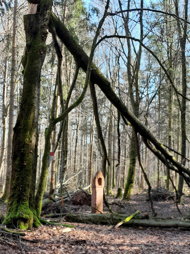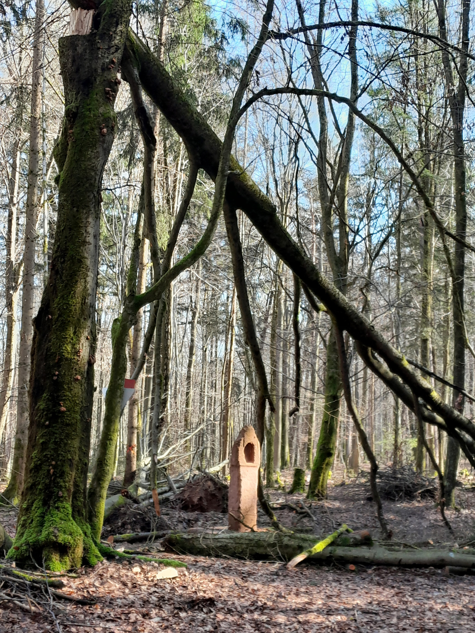 Dammbach-Wintersbach. Der Scharstein im Wald oberhalb Wintersbach hat schon fast ein halbes Jahrtausend allen Stürmen getrotzt, die über die Spessarthöhen hinweggebraust sind. Doch in diesem Winter hätte es ihn beinahe erwischt, den sagenumwobenen und immer noch geheimnisvollen Bildstock am Weg von der Heimbuchenthaler Martinskirche zur Krausenbacher Ferschenmühle. Falls im letzten Sturm das „Wilde Heer“ mitgeritten ist, hat um den Scharstein herum bestimmt eine Rotte Schutzengel Wache gehalten: Zart rosa leuchtend in den Strahlen der Frühlingssonne steht das Denkmal inmitten des Trümmerhaufens einer zerbrochenen Buche. Der eine Teil der Krone liegt am Boden, der andere Teil hängt noch wie ein Damoklesschwert genau über dem Flurdenkmal.